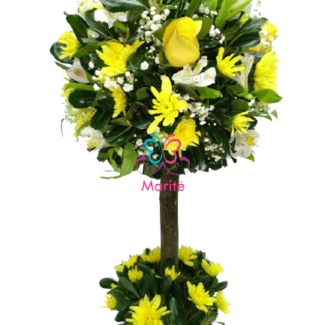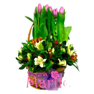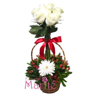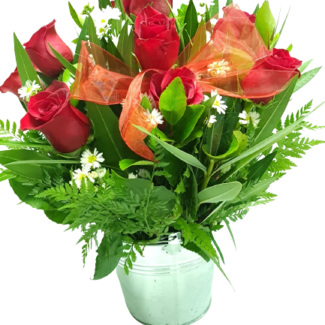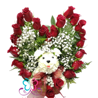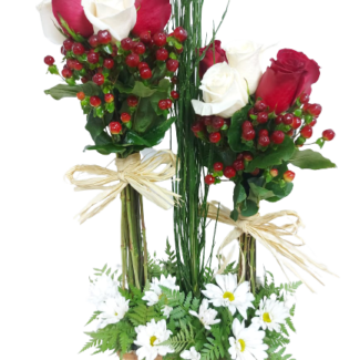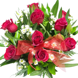 Circular Elevada de Rosas Rojas, elaborada con 20 rosas rojas y 3 pequeños bombones.