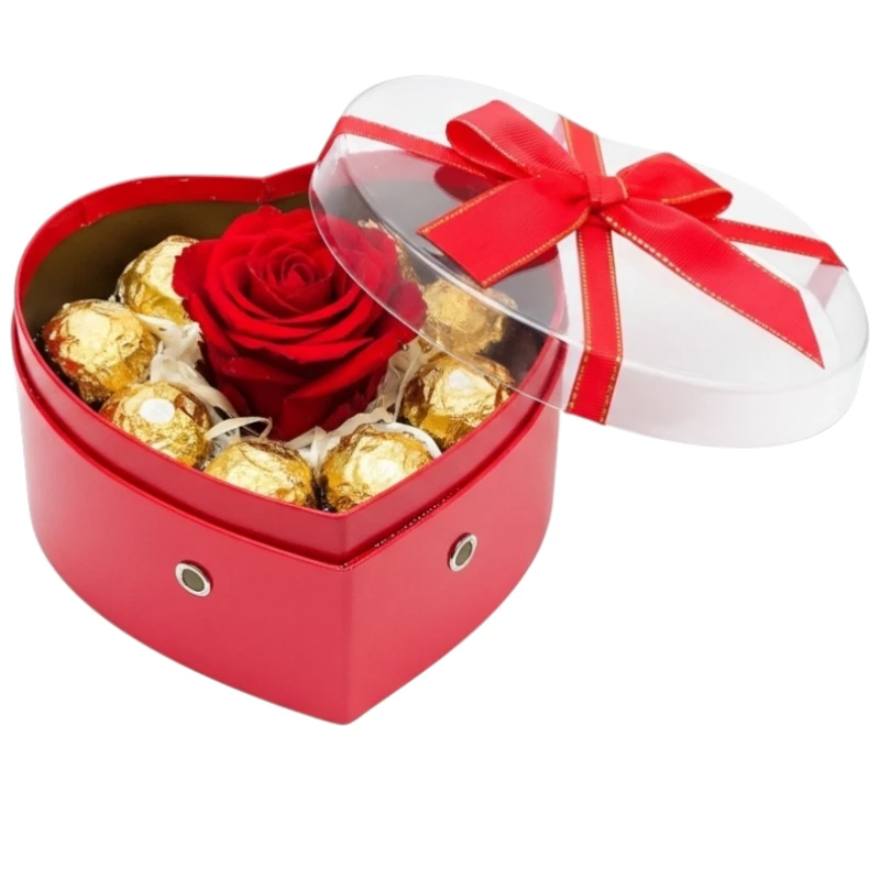 Presentada en una delicada caja en forma de corazón con tapa transparente y acompañada de exquisitos chocolates, es el detalle perfecto para sorprender en aniversarios, cumpleaños o simplemente decir “te amo”.