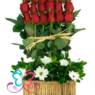 Bello arreglo floral elaborado en formas de torres cada una esta compuesta por 8 rosas ecuatorianas, acompañada de pequeños hipericum.