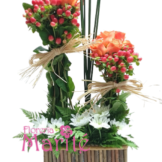 Bello arreglo floral elaborado en formas de torres cada una esta compuesta por 8 rosas ecuatorianas, acompañada de pequeños hipericum.