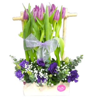 Bello arreglo floral elaborado con 20 tulipanes naranjas.